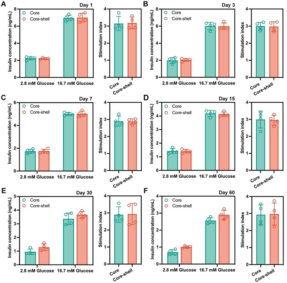 图6:封装于核心微凝胶或核壳微凝胶中胰岛细胞的长期胰岛素分泌情况