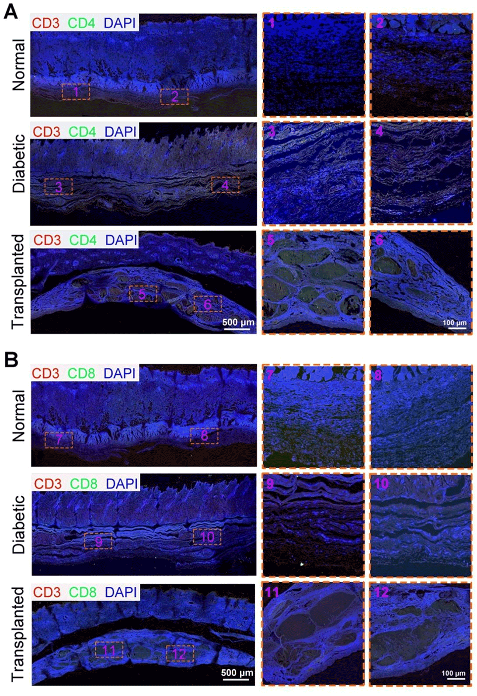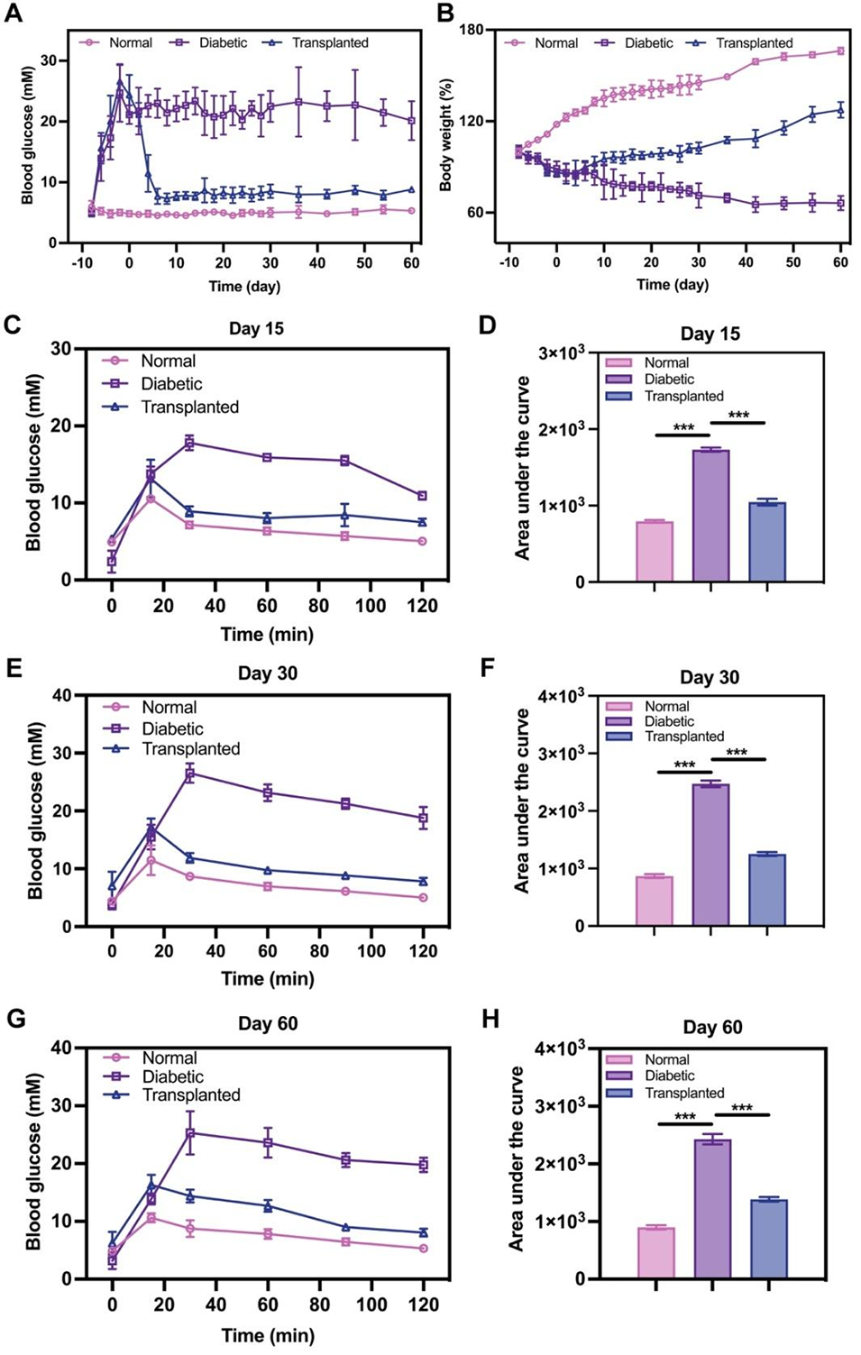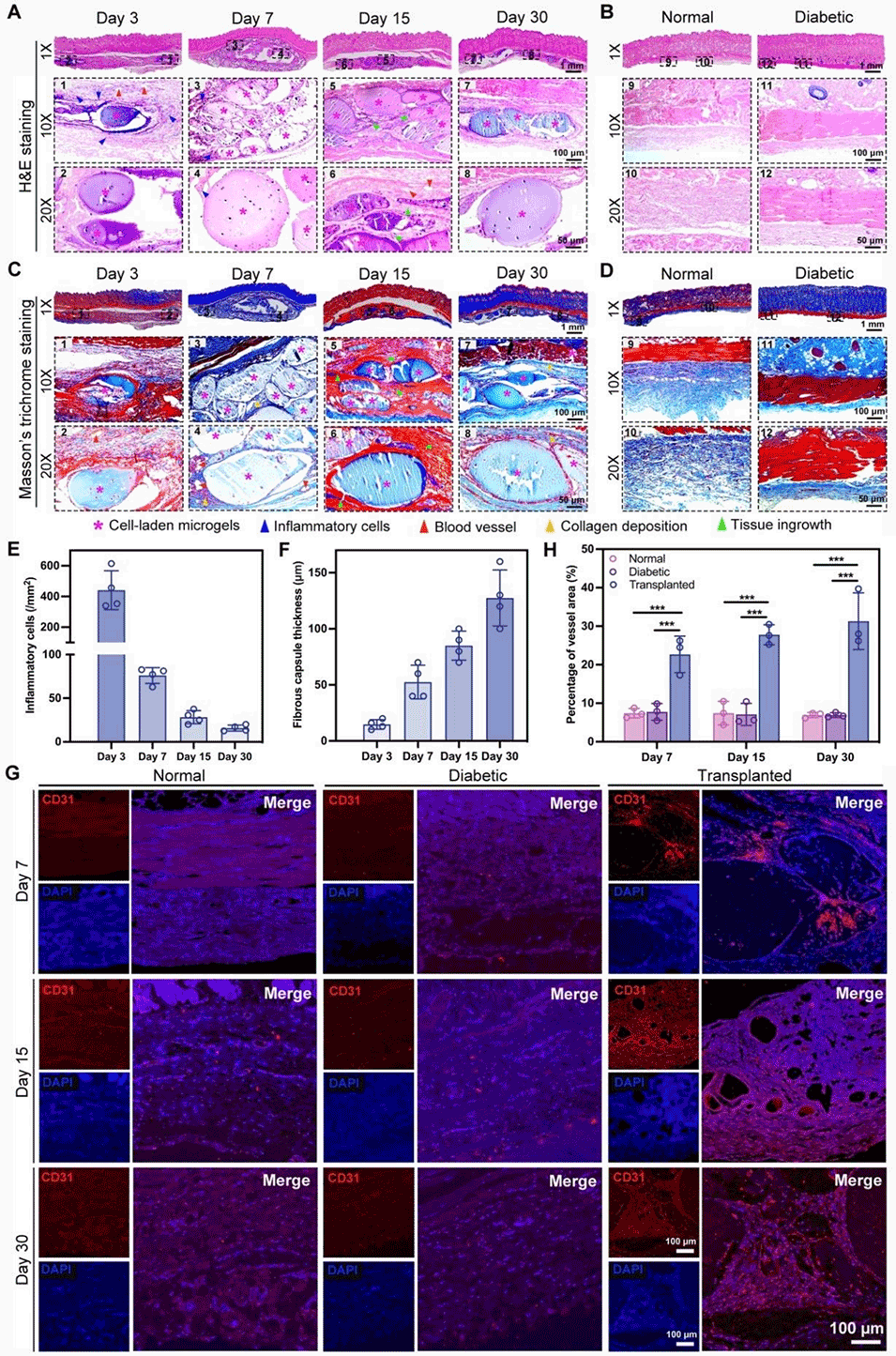 4、将微凝胶移植至糖尿病大鼠皮下,可快速恢复并稳定血糖水平达60天,促进血管生成与组织整合,且未引发明显纤维化包裹。该体系为无需免疫抑制的胰岛移植提供了可行策略。