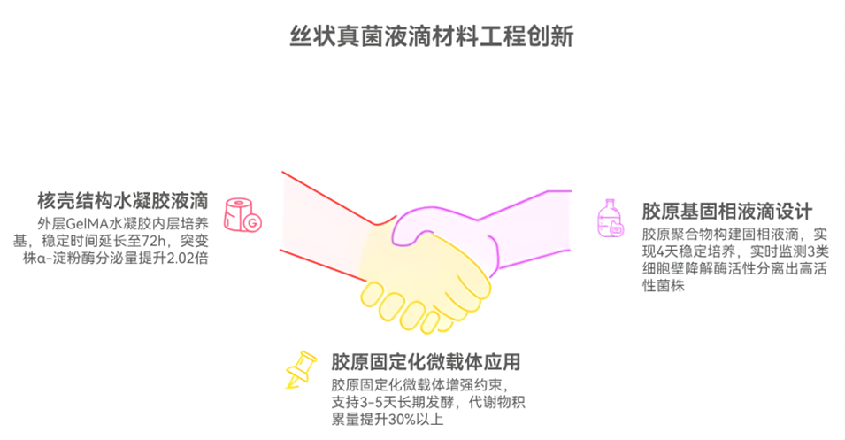 3、重点分析了应对丝状真菌液滴破裂的策略,包括物理限制、仿生核壳水凝胶和基因工程方法等。