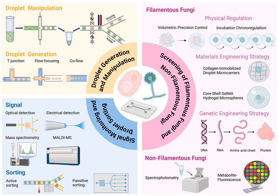 图1. 微流控原理、液滴微流控筛选的不同信号及其在丝状真菌和非丝状真菌中的应用示意图