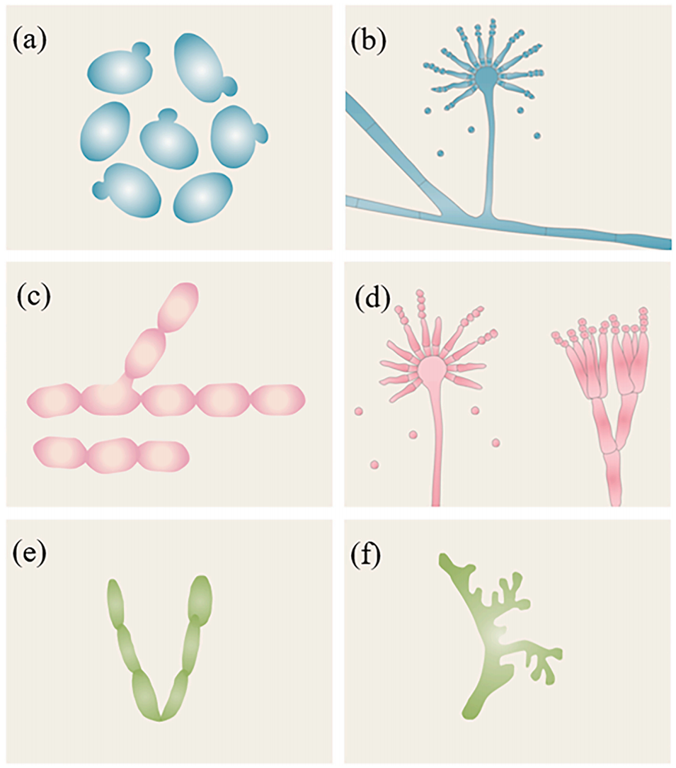 图2. 工业真菌的常见类型及代表性孢子、菌丝形态。(a)酿酒酵母(S. cerevisiae)、(b)黑曲霉(A. niger)的示意图;(c)孢子、(d)分生孢子(conidia)、(e)球拍状菌丝(racquet-shaped mycelium)、(f)鹿角状菌丝(antler-shaped mycelium)的示意图