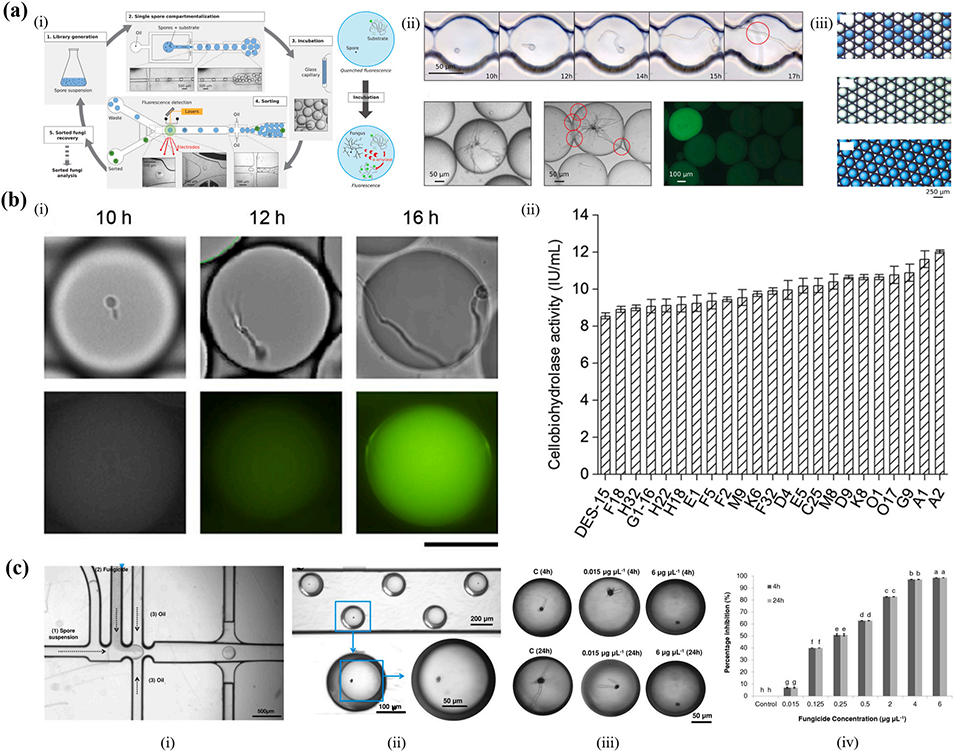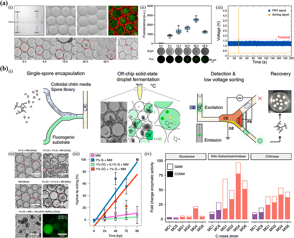 工业真菌是生产多种生物制品的关键候选菌株。为提高其产量,常需进行基因改造,但传统筛选方法存在通量和灵敏度限制。液滴微流控技术通过将单个真菌孢子或细胞封装在皮升至纳升级液滴中,形成独立微反应器,实现实时监测和精准单细胞分析,有效克服了琼脂平板和流式细胞术等方法的不足。