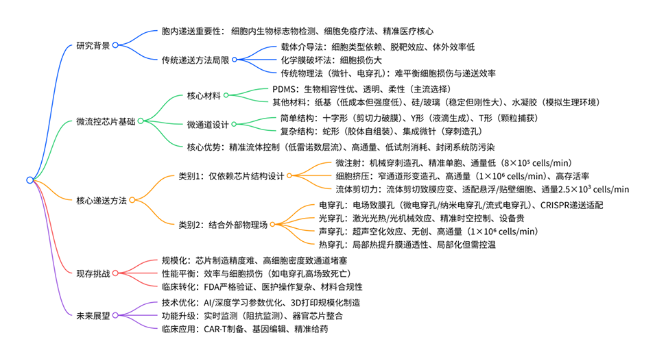 1、本文综述了基于微流控技术的物理胞内递送方法,指出胞内递送是精准医疗与细胞免疫疗法的核心策略,传统载体介导法受细胞类型限制、化学膜破坏法存在细胞损伤,而物理膜破坏法中微流控芯片因精准时空控制和高通量成为关键解决方案。