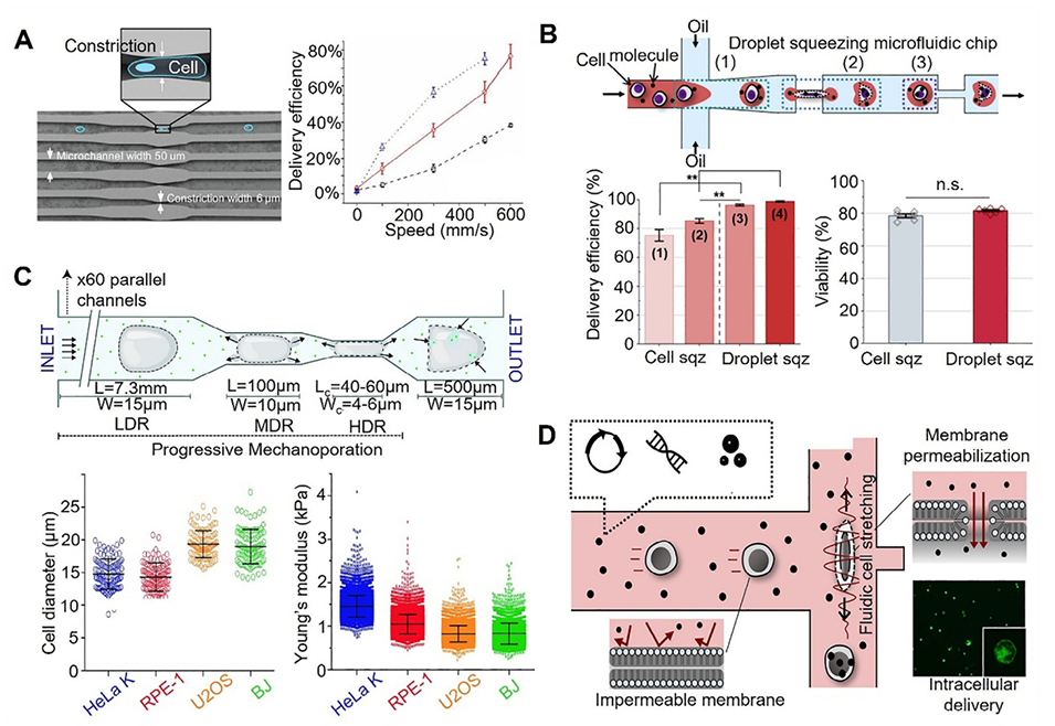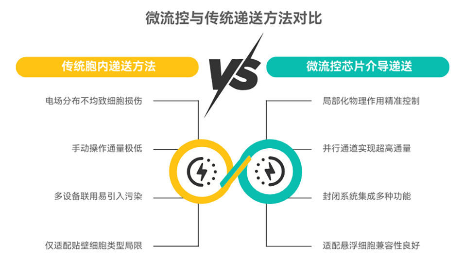 将外源性生物大分子有效递送至细胞内,在精准医疗和细胞治疗等领域至关重要。相较于受限于载体类型且效率较低的载体递送法,基于膜破坏的物理递送法展现出巨大潜力。然而,传统物理方法(如微针、电穿孔)难以平衡递送效率与细胞损伤。微流控芯片凭借其精确的流体控制、高通量和微型化优势,为解决这一难题提供了新平台。