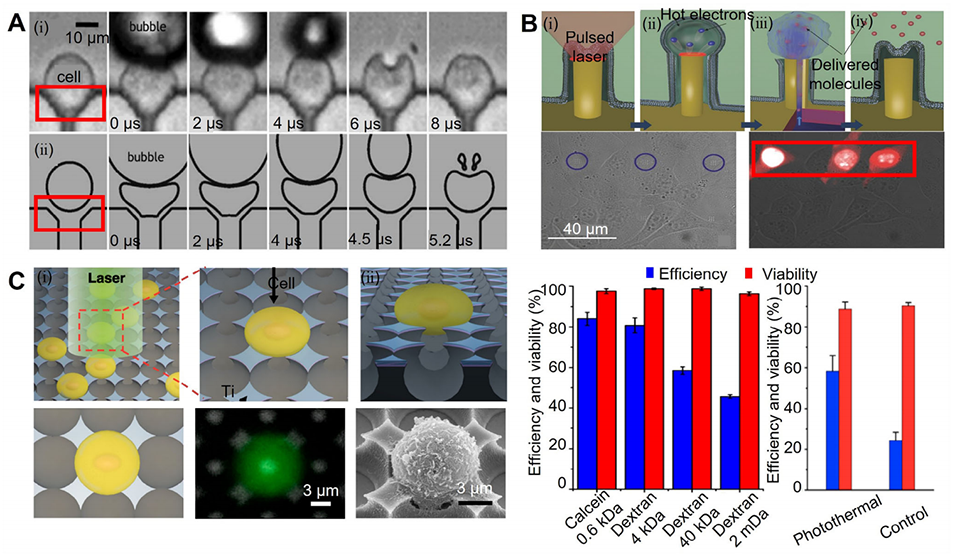 2、其核心递送方法分为两类:一是仅依赖芯片结构设计的微注射、细胞挤压、流体剪切力;二是结合外部物理场的电穿孔、光穿孔、声穿孔、热穿孔。文章重点阐述了各类方法的机制、具体途径、应用、优势与局限性。