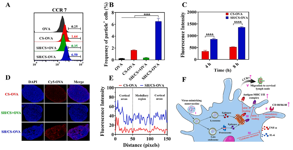 3、与未修饰疫苗相比,SH/CS-OVA 在穿透黏液层和逃逸巨噬细胞吞噬方面表现卓越,效率分别提升了3倍和4.8倍,并显著增强了树突状细胞的招募、摄取与成熟。