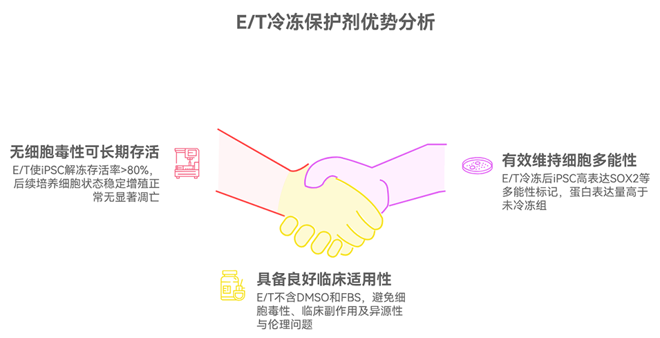 3、结果表明,由12%乙二醇和4%海藻糖(E/T)组成的冷冻保护剂,在多种细胞系(GES、U251、HepG2、A549、3T6)及诱导多能干细胞(iPSCs)的冷冻保存中均能维持90%以上(iPSCs >80%)的复苏后存活率。