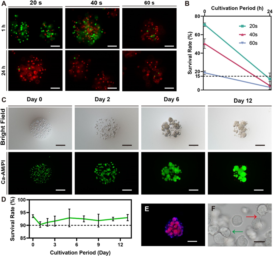 图2. 包封于甲基丙烯酰化明胶(GelMA)或海藻酸钙(ALG)微球中的 U251 细胞保持高存活率