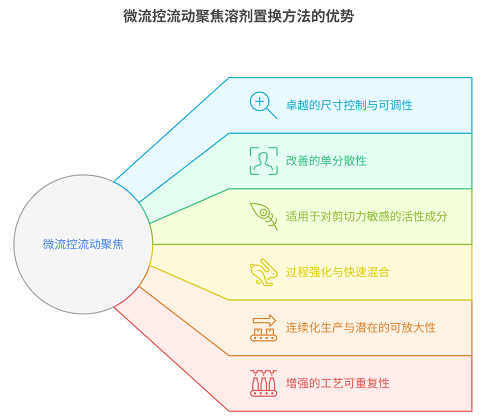 5、与传统批量溶剂置换法相比,该微流控方法在尺寸控制方面表现出显著优势。进一步优化装置有望提高重现性与可扩展性。