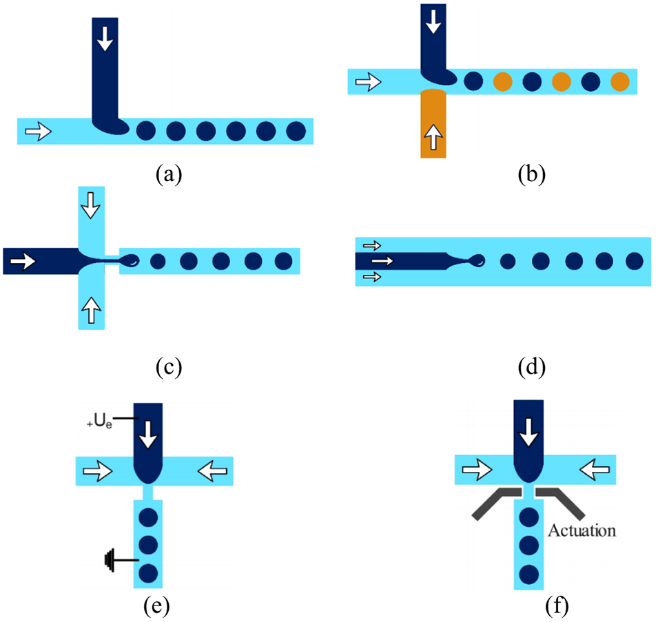 图3:微流控微滴生成原理(a. T 型结构、b. 交替 T 型结构、c. 流动聚焦、d. 共轴流、e. 电场辅助、f. 气动驱动)