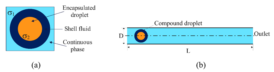 图5:a. 复合微滴的二维示意图;b. 直微通道中的复合微滴