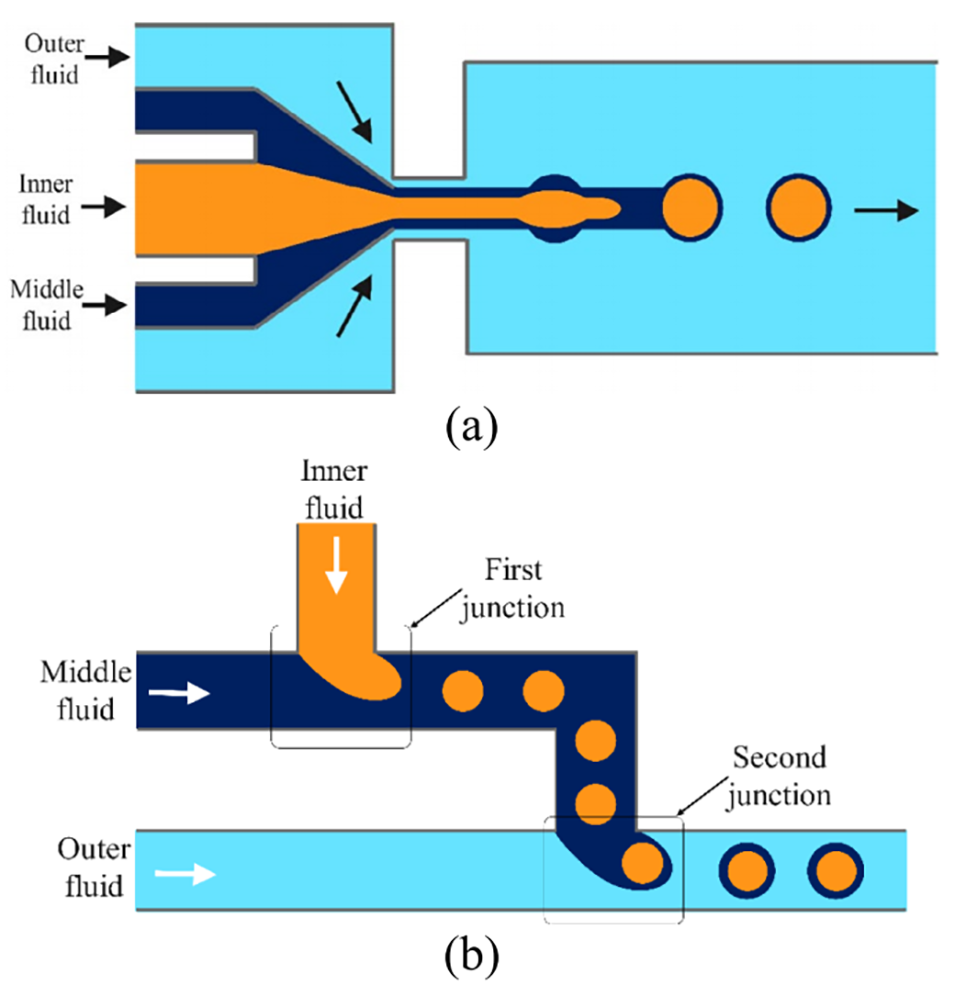 图6:双乳液微流控液滴的生成(a. 流动聚焦法、b. 串联 T 型结法)