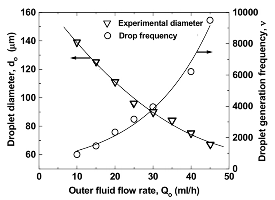 图8:微流控液滴直径及生成频率随连续相流速变化的实验观测(含拟合曲线)