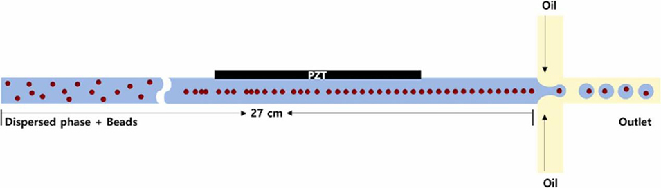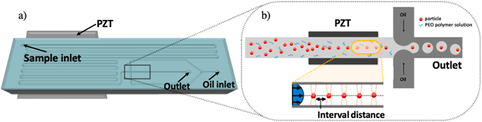 2、该系统利用声泳使粘弹性介质中悬浮的颗粒或细胞在微通道中部聚焦并均匀排序,再生成液滴,空液滴率仅7%。