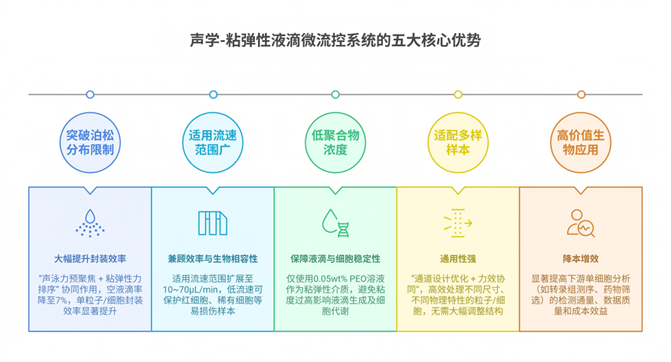 1、本研究开发了一种声学-粘弹性液滴微流控系统,通过将声泳力与粘弹性力结合,实现了不受泊松分布限制的高效单颗粒/细胞封装。