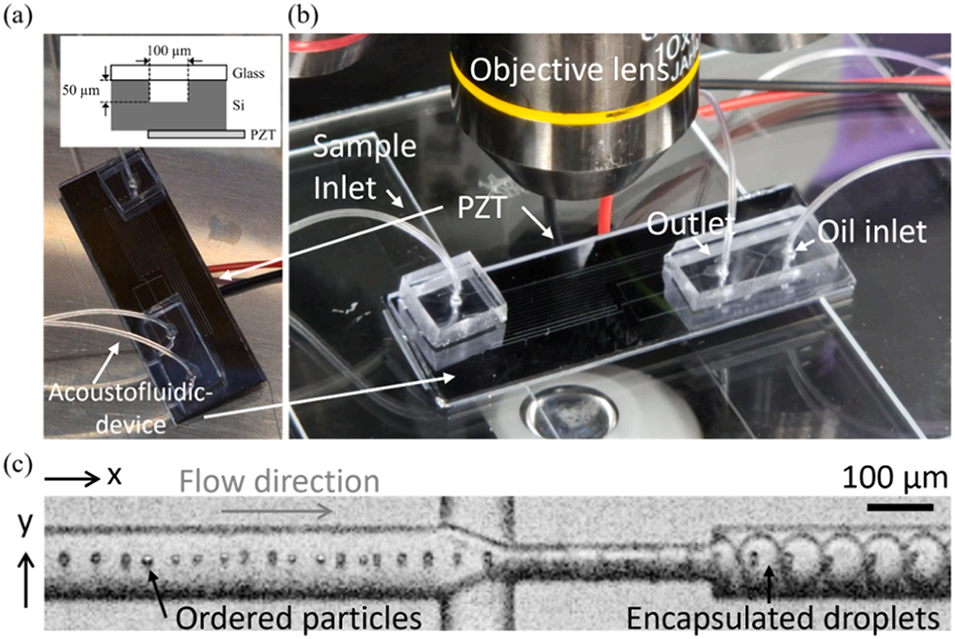 图2.(a)制备的声流体器件光学图像及其粒子排序区的横截面(100×50μm²)示意图;(b)实验装置图:粒子/细胞样本与油相从入口流入,单个7.5MHz压电换能器(PZT)产生声驻波,使粒子/细胞在矩形通道中心聚焦;粘弹性力不仅能实现粒子/细胞的三维聚焦,还能使其在通道中心有序排列;(c)13μm聚苯乙烯(PS)粒子封装过程的高速相机图像。