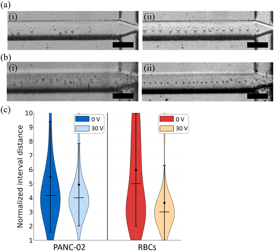 图6. 高速相机图像:(a)流速为40μL/min时,施加PZT(i)0V、(ii)30V电压的胰腺癌细胞(PANC-02);(b)流速为40μL/min时,施加PZT(i)0V、(ii)30V电压的红细胞(RBCs)排序与封装过程;(c)施加与不施加电压时,PANC-02细胞和RBCs的间距分布(比例尺:100μm)。