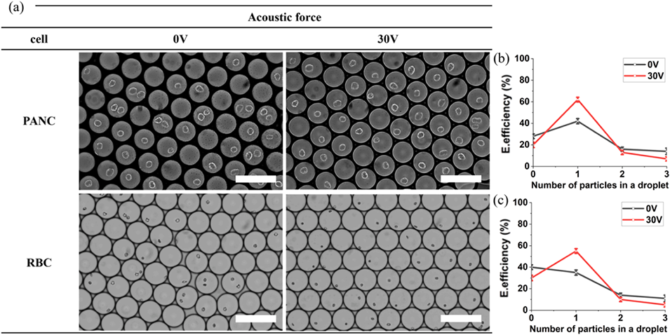图7.(a)流速为40μL/min、施加与不施加PZT 30V电压时,PANC-02细胞和RBCs的液滴封装光学图像;(b)PANC-02细胞、(c)RBCs在施加与不施加PZT 30V电压时的液滴封装概率(比例尺:100μm)。