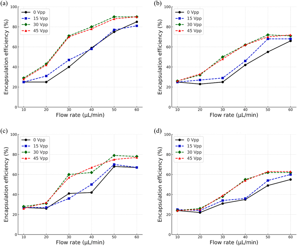 图8. 不同流速与声泳力条件下的单粒子/细胞液滴封装效率;该效率通过Python程序分析三次实验中收集的300个液滴(总样本量Ntotal=300)视频图像得出:(a)13μm粒子;(b)6μm粒子;(c)PANC-02细胞;(d)RBCs。