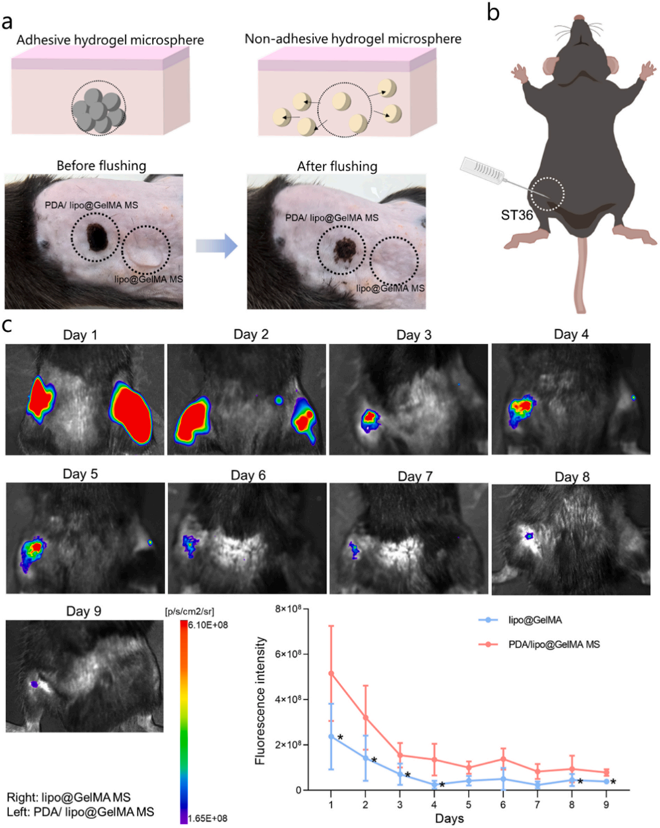 图3. 水凝胶微球的粘附性与穴位滞留性表征。a)水凝胶微球粘附性能的评估结果;b)穴位注射示意图;c)微球在穴位处的体内滞留能力表征(n=6)。采用双向重复测量方差分析(ANOVA)结合邦费罗尼事后检验分析时间×组间差异,*p<0.05。