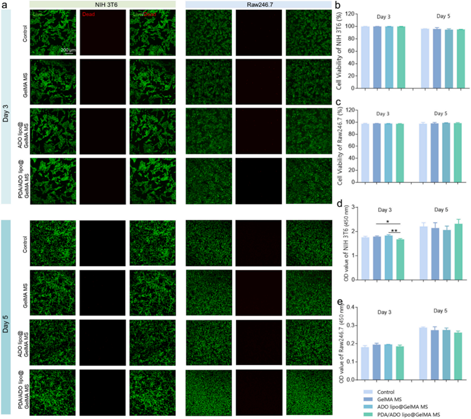 图2. 水凝胶微球的生物相容性表征。a)与水凝胶微球共培养细胞的活/死染色结果;b)NIH 3T6细胞的存活率定量结果(n=3);c)Raw246.7细胞的存活率定量结果(n=3);d)NIH 3T6细胞的细胞计数试剂盒-8(CCK8)检测结果(n=3);e)Raw246.7细胞的细胞计数试剂盒-8(CCK8)检测结果(n=3)。采用单因素方差分析(ANOVA)进行数据统计,*p<0.05,**p<0.01。