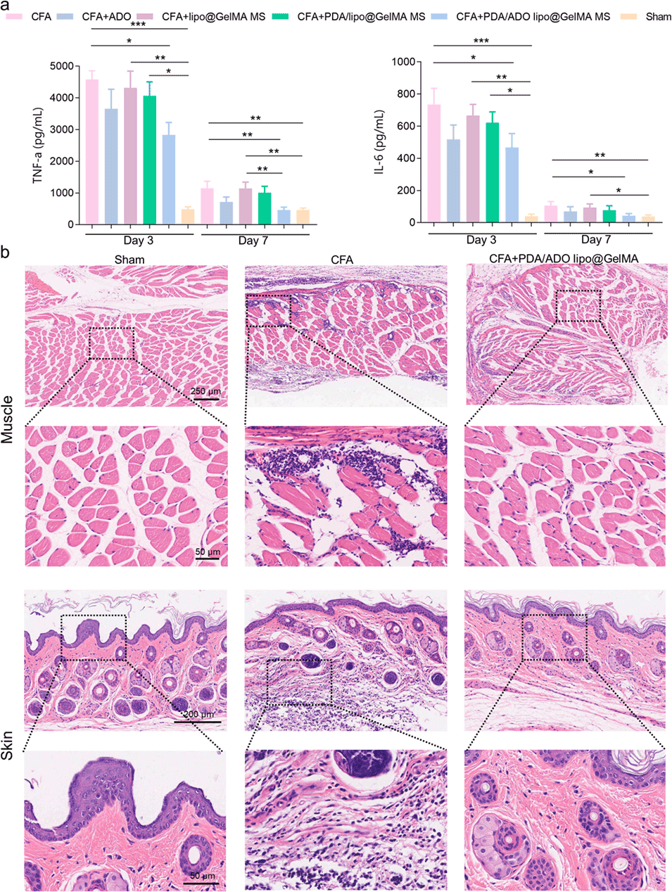 图5. 炎症疼痛模型中的体内抗炎效果评估。a)体内炎症相关细胞因子(肿瘤坏死因子-α,TNF-α;白细胞介素-6,IL-6)的水平;b)小鼠足底周围肌肉与皮肤组织的苏木精-伊红(H&E)染色结果(n=6)。采用克鲁斯卡尔-沃利斯检验(Kruskal-Wallis tests)进行数据统计,*p<0.05,**p<0.01,***p<0.001。
