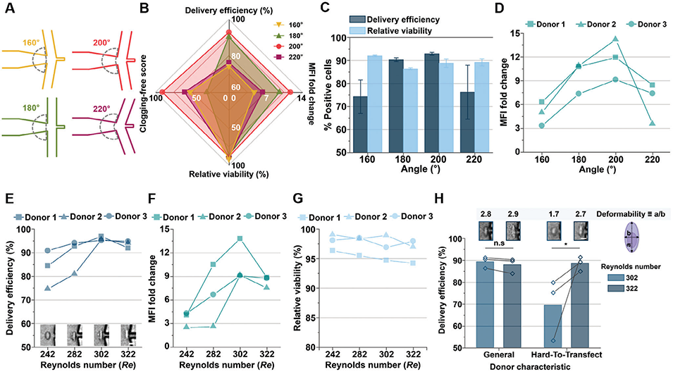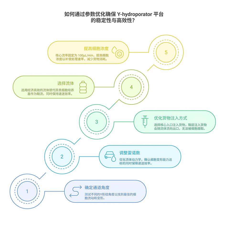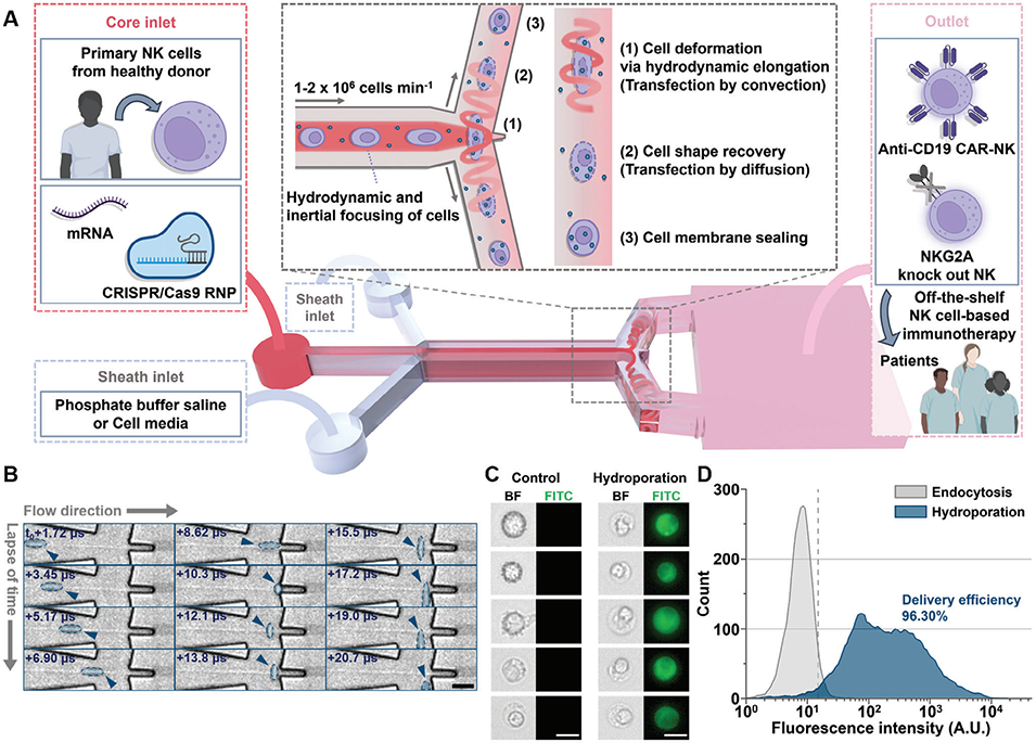 2、该平台采用Y型微通道结构,含1个核心入口(注入NK细胞与cargo混合物)和2个鞘层入口(注入细胞培养基或缓冲液);细胞在通道滞止点经历约20微秒的快速流体动力学拉伸,细胞膜形成瞬时孔隙,从而促进外源性货物(mRNA、CRISPR/Cas9等)的摄取。