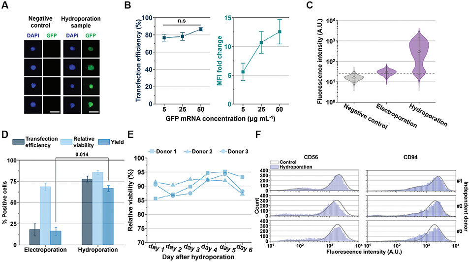 3、Y-hydroporator可实现高递送和转染效率,处理速度达每分钟约2×106个细胞,同时保持长期细胞活性(>89%)和功能。