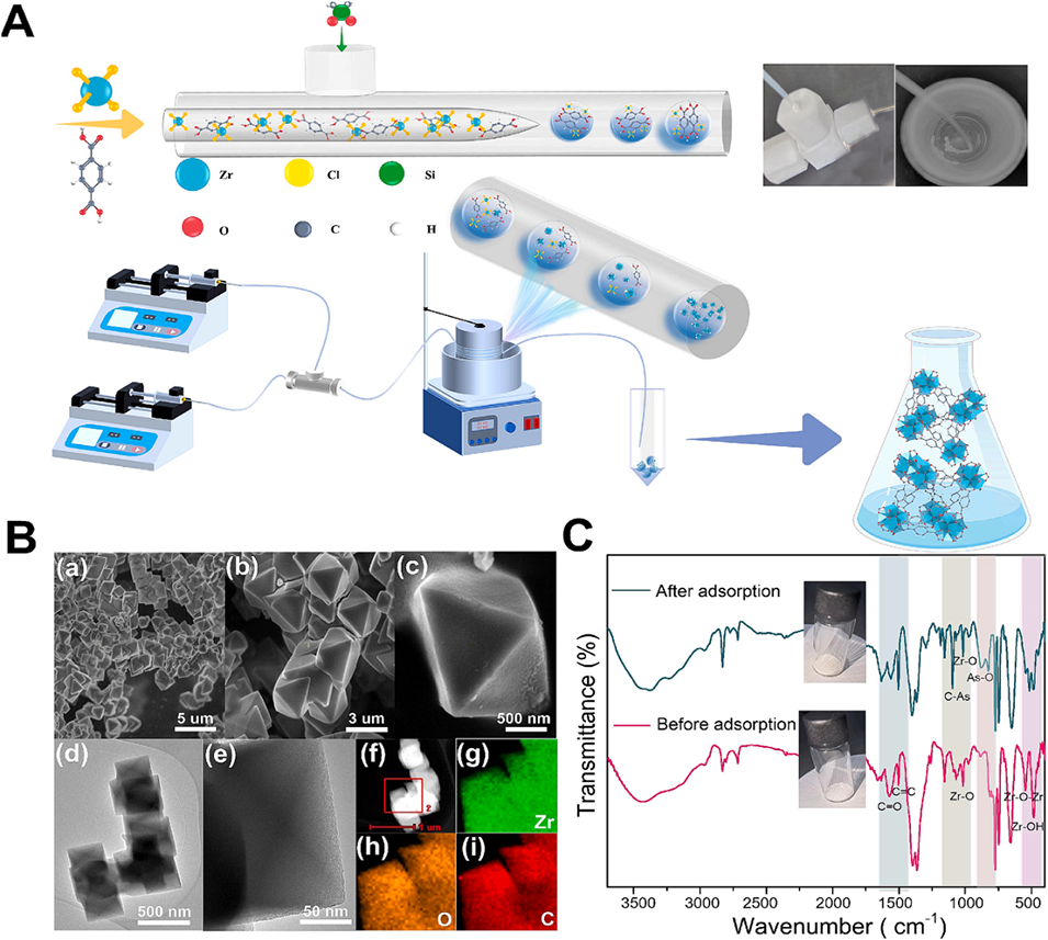 当前,能够高效且无二次污染地去除有机砷的方法十分有限。金属有机框架(MOFs)作为吸附材料虽具潜力,但传统MOFs合成多采用耗时的水热法或溶剂热法,结晶需数小时至数天,还面临混合不均、传质效率低、合成条件难精准控制、反应优化耗时、有机溶剂消耗大且成本高的问题,难以实现商业化大规模制备。