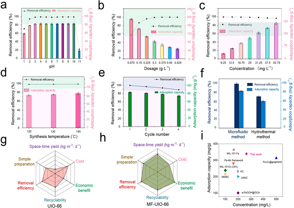 近期,福州大学环境与安全工程学院肖高副教授团队开发了一种高通量、连续的微流控合成新策略,成功制备出具有均匀微观结构的MF-UIO-66材料,并将其用于高效去除水体中的有机砷污染物。该材料在吸附容量、循环稳定性和合成效率方面均显著优于传统水热法制备的样品,为金属有机框架材料的规模化制备与水污染控制提供了新路径。相关研究以“High-throughput continuous microfluidic magnifiable manufactured microstructured MOFs-mediated micropollutants mitigation (M7)”为题,发表于期刊《Separation and Purification Technology》。