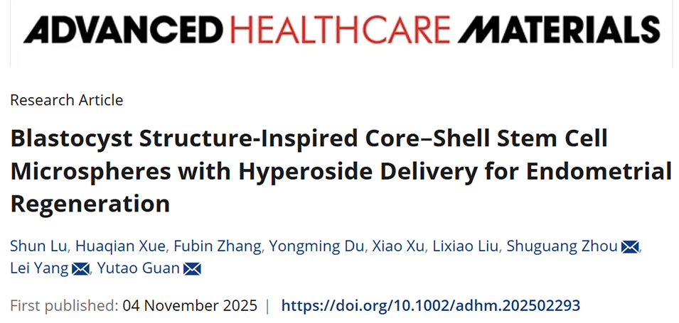 鉴于此,宁波大学附属第一医院妇一科主任管玉涛、浙江省农业科学院蚕桑研究所Lei Yang、安徽省妇幼保健院周曙光教授等人受囊胚结构启发,利用微流控电喷雾技术成功开发出一种核壳微球(HBM),其外壳负载金丝桃苷用于调控早期炎症,内核封装骨髓干细胞以促进组织修复,该双级递送系统在大鼠模型中显著促进了子宫内膜再生与功能恢复。相关研究以“Blastocyst Structure‐Inspired Core–Shell Stem Cell Microspheres with Hyperoside Delivery for Endometrial Regeneration”为题目,发表在期刊《Advanced Healthcare Materials》上。