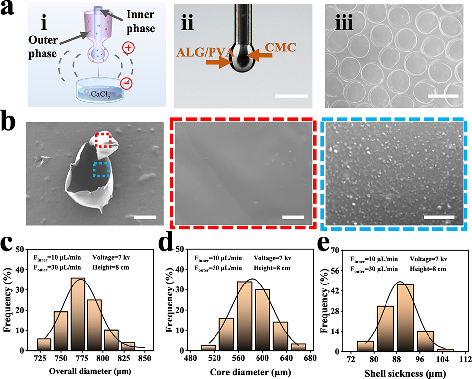 2、该微球采用微流控电喷雾技术制备,外壳为海藻酸钠包裹Fe3O4@MgSiO3磁性纳米颗粒,内核为羧甲基纤维素包封的BMSCs,可实现时序释放。