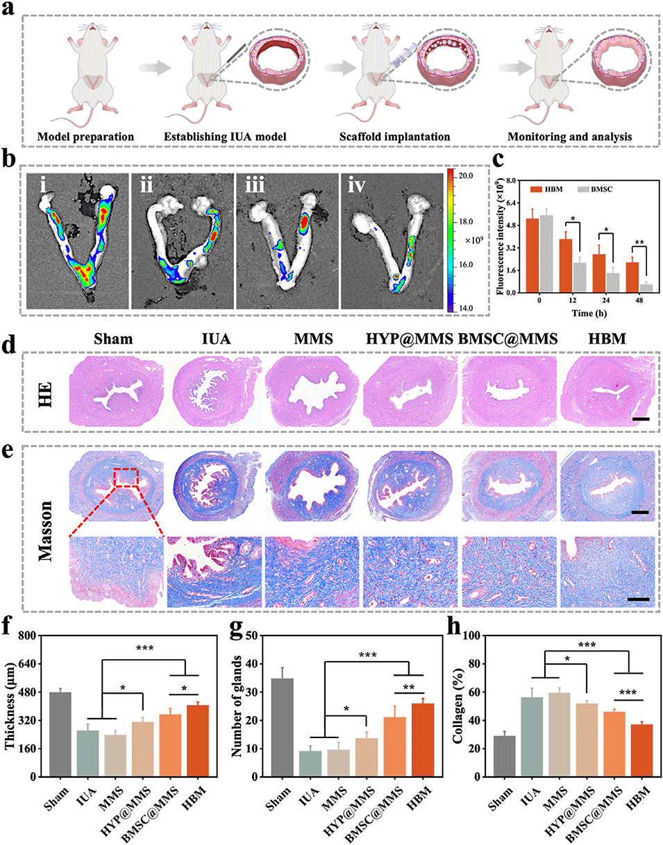 1、针对子宫内膜损伤及宫腔粘连(IUA)的治疗难题,本研究受囊胚结构启发,开发了一种核壳微球(HBM),用于递送骨髓间充质干细胞(BMSCs)和金丝桃苷(HYP)。