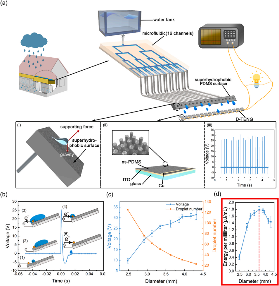 图1:超疏水微流控工程化液滴摩擦纳米发电机及最优液滴尺寸