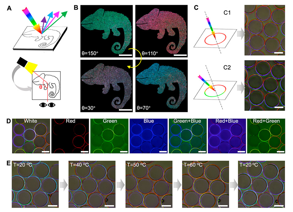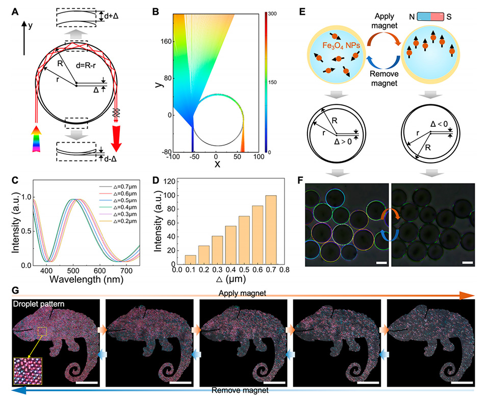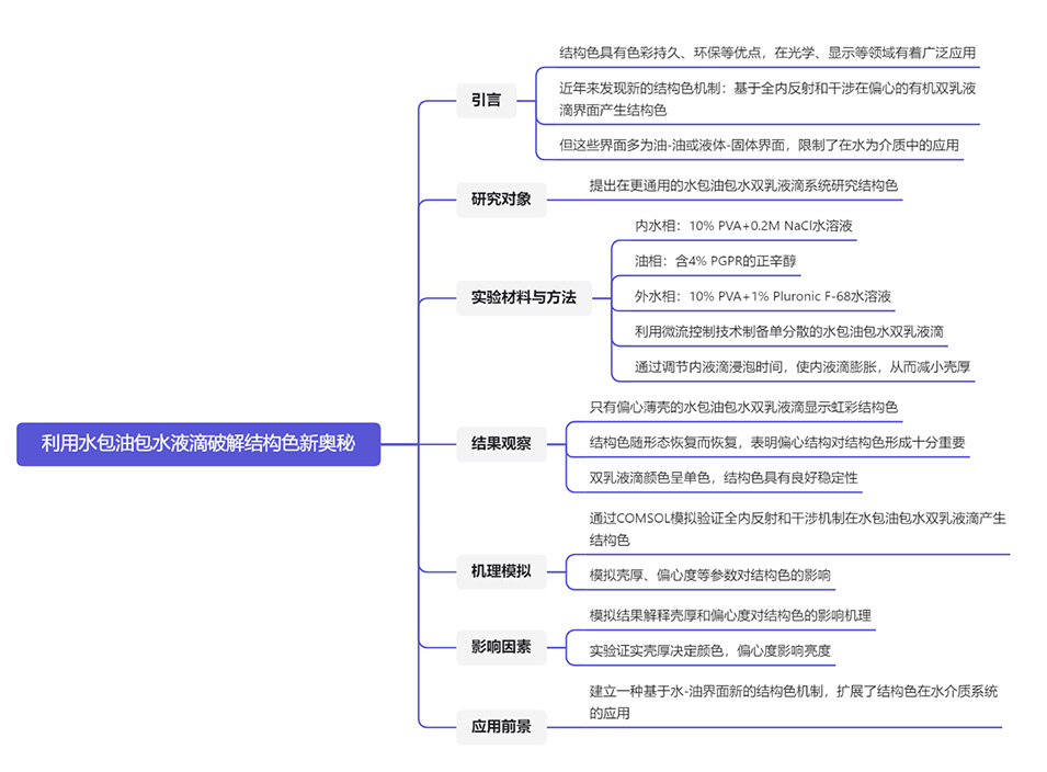 1、在水包油包水(W/O/W)双乳液液滴中,通过微尺度凹面界面的全内反射和干涉实现可调结构着色,从而产生虹彩结构色。
