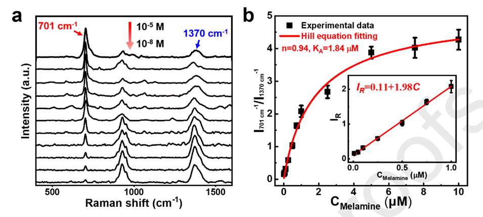 图3.(a)显示三聚氰胺溶液浓度从1×10-5M到1×10-8M逐渐减小的SERS光谱。(b)“I701cm-1/I1370cm-1”相对强度与三聚氰胺浓度的关系。黑色方块:实验值“I701cm-1/I1370cm-1”。红色曲线:Hill方程拟合。插图显示“I701cm-1/I1370cm-1”与三聚氰胺浓度(1×10-6M~1×10-8M)的线性拟合。误差条表示“I701cm-1/I1370cm-1”的标准偏差。