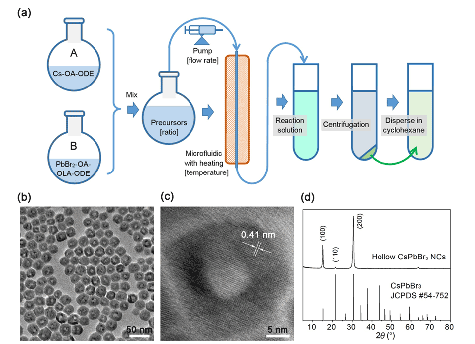 1、本研究采用微流控合成技术结合纳米级Kirkendall效应,成功制备了空心CsPbBr3钙钛矿纳米晶体。