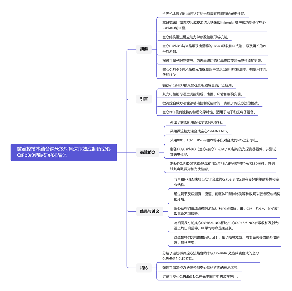 6、易于规模化生产:微流控合成技术具有很好的可重复性和可控性,为空心CsPbBr3钙钛矿纳米晶体的规模化生产提供了可能,有助于实现工业应用。