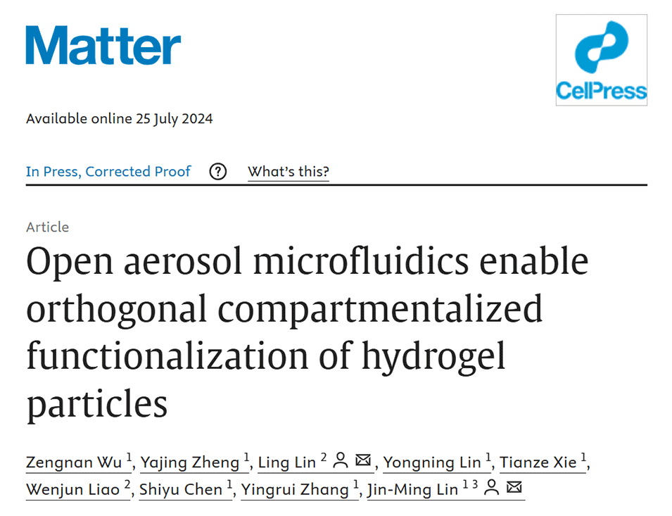 近期,清华大学林金明教授团队联合北京工商大学林玲教授团队提出了一种开放气溶胶微流控(OAMF)方法,用于一步法制备具有正交功能化的区室化水凝胶微粒,实现了对微粒内部结构和表面功能的独立控制,为器官芯片技术提供了一种灵活设计工程微粒的新途径。相关研究以“Open aerosol microfluidics enable orthogonal compartmentalized functionalization of hydrogel particles”为题目发表于期刊《Matter》。