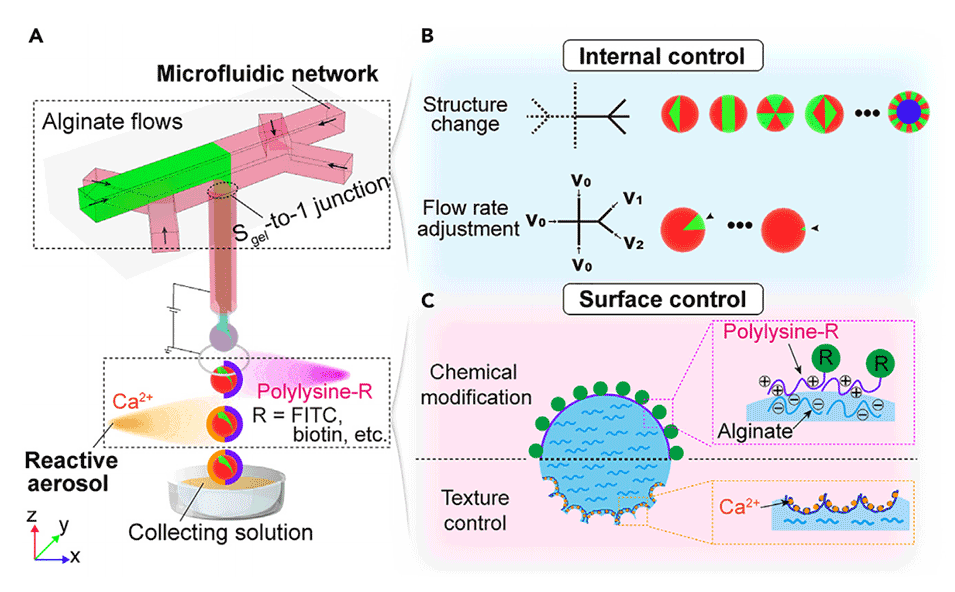 2、该技术利用微流控网络调整颗粒内部多室结构,并通过反应性气溶胶精确工程化微粒表面,实现了对微粒内部和表面功能的独立控制。