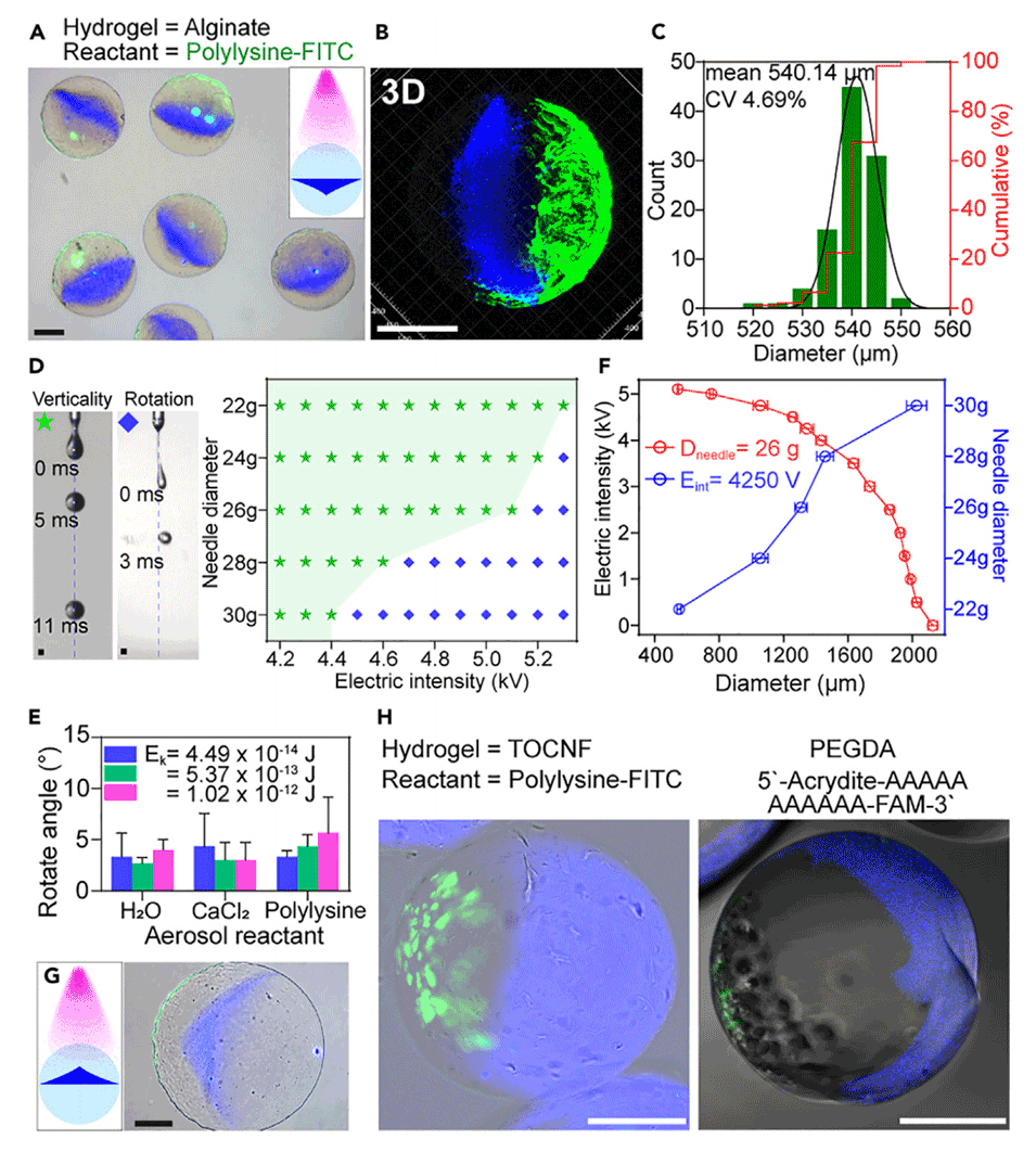 1、本研究提出了一种开放气溶胶微流控(OAMF)方法,用于制造具有正交功能化内外部结构的水凝胶微粒。