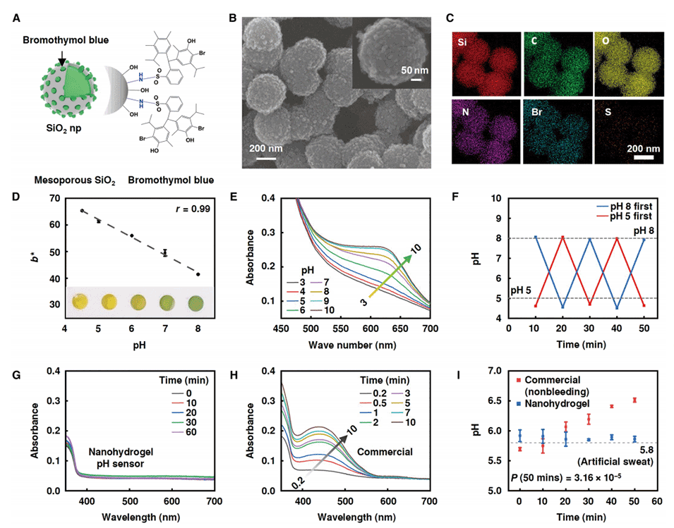 图4.溴百里酚蓝缀合二氧化硅纳米粒子作为可逆比色pH传感器。