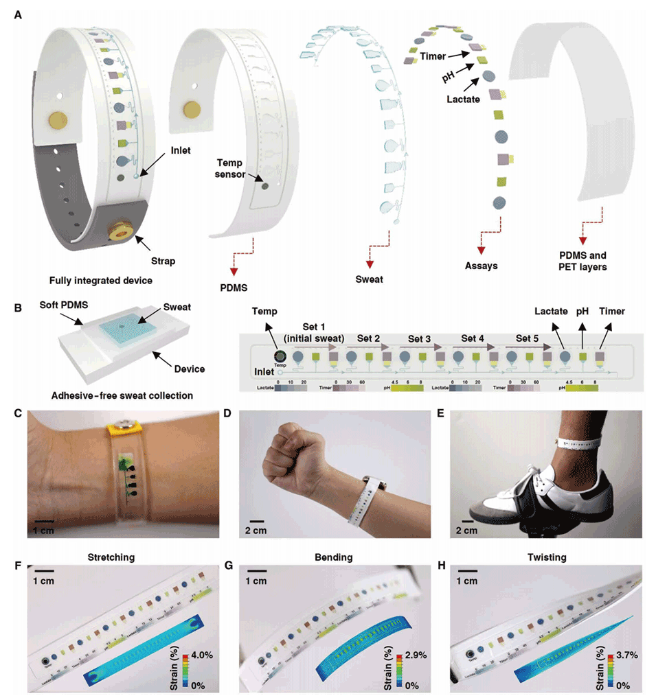 1、开发了一种可穿戴微流控带,其集成了比色计时器和生化检测装置,能够在不同运动强度下实时捕获汗液并测量pH值和乳酸浓度。