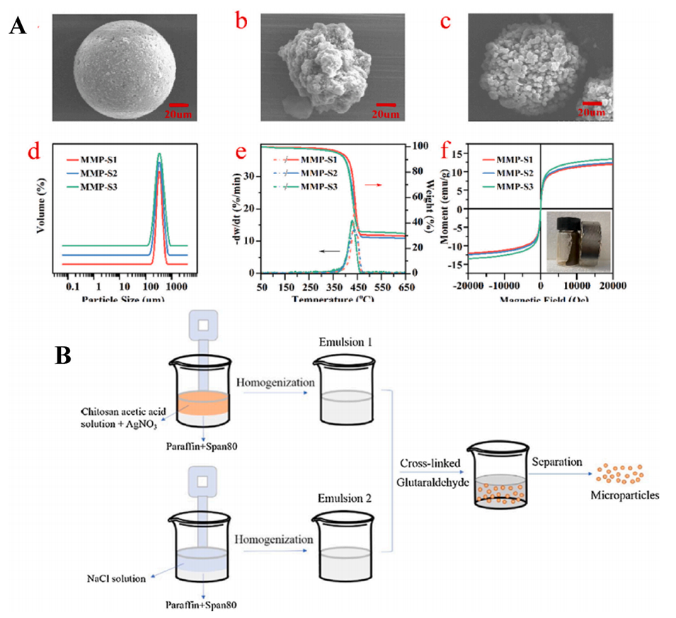 图5.(A)PS@Fe3O4的表征:MMP-S1的SEM(a),MMP-S2的SEM(b),MMP-S3的SEM(c);DLS光谱(d);TGA曲线(e);磁化曲线(f)。(B)AgCl@CM微球制备示意图。