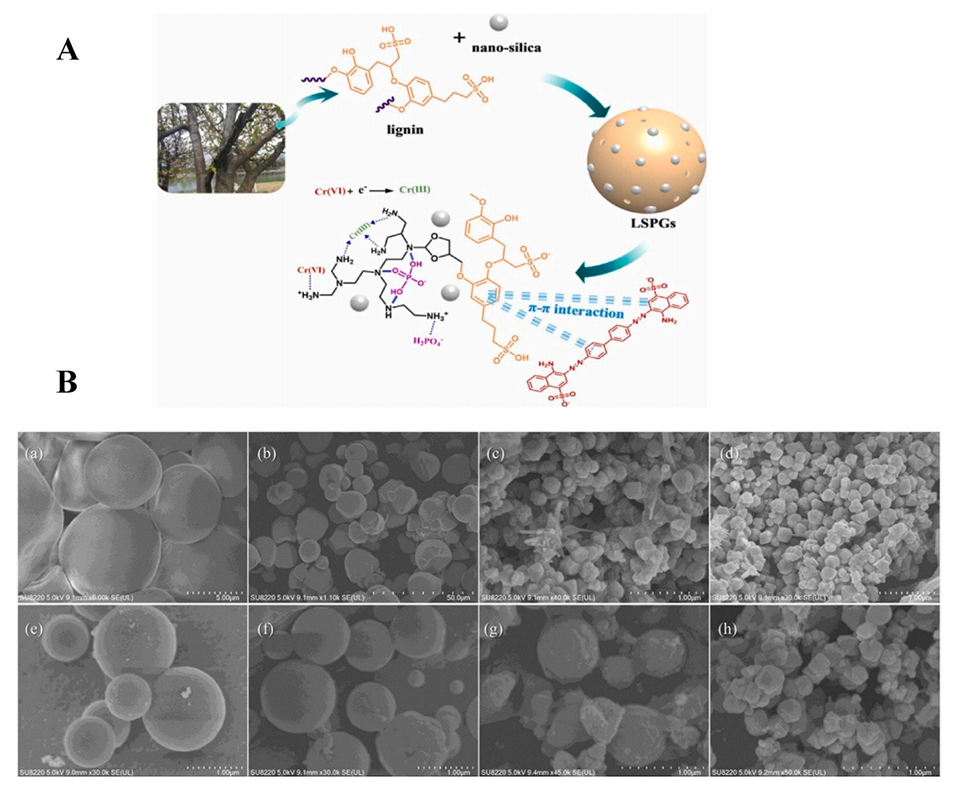 图6.(A)木质素基复合微球LSPGs的制备。(B)木薯淀粉(a)、MS(b)、AAM-MSM(不添加MMA)(c,d)、AAM-MSM(添加MMA)(e,f)、吸附Cd(II)的AAM-MSM(g,h)的SEM图像。