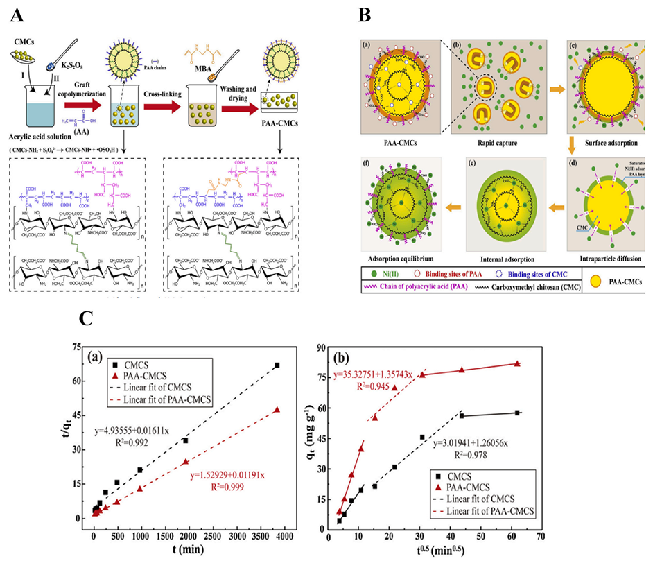 图11.(A)PAA-CMCs制备示意图。(B)吸附机理示意图。(C)(a)伪二阶模型的线性拟合曲线;(b)颗粒内扩散模型(Ni(II)溶液=50mL,Ni(II)浓度=150mg/L,T=298K,吸附剂用量=0.05g)。