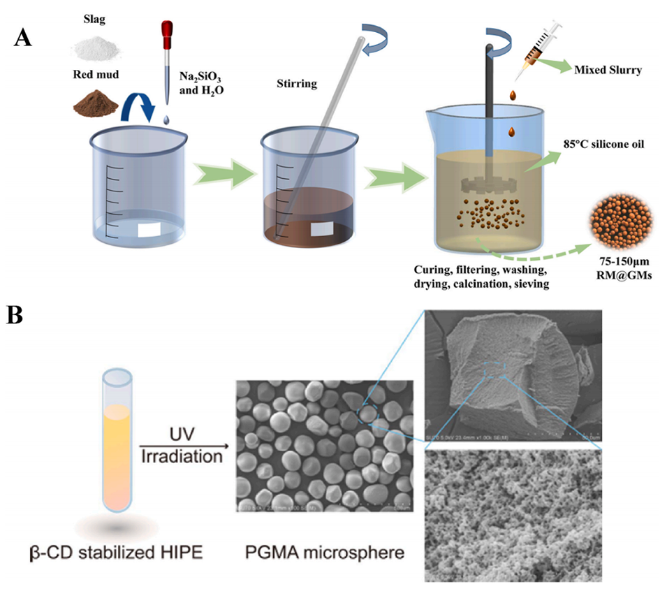图8.(A)RM@GMs制备流程图。(B)光引发剂引发聚合反应形成PGMA微球的示意图。