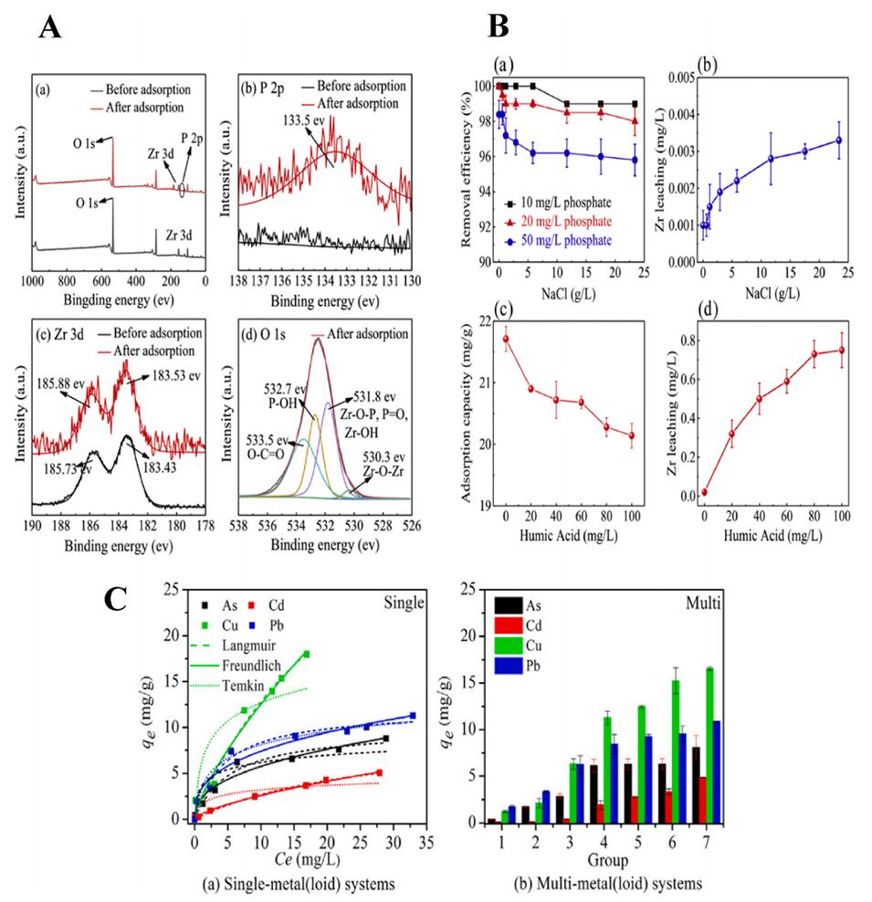 图14.(A)NH-SA-ZrBT在磷酸盐吸附前后的XPS分析:(a)宽扫描光谱;(b)P2p;(c)Zr3d;(d)O1s。(B)NaCl和HA对磷酸盐吸附性能的影响(磷酸盐浓度:40mg/L;溶液体积:40mL;珠粒数:20;接触时间:48h):(a)不同NaCl浓度下的磷酸盐去除效率和(b)Zr离子浸出;(c)吸附容量和(d)不同HA浓度下Zr离子的浸出。(C)在单金属(loid)体系和多金属(loil)体系中,初始浓度对CPM上As(III)和重金属吸附容量的影响。(Ce:初始浓度,mg/L;条件:pH=5.0;接触时间8h;吸附剂剂量2.4g/L;温度25℃)。