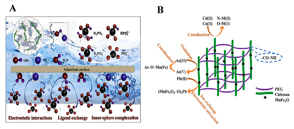 图15.(A)NH-SA-ZrBT吸附磷酸盐的可能机制。(B)CPM对As(III)和重金属的吸附机理。