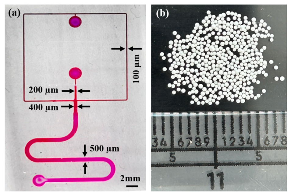 图2.数字图像显示(a)在微反应器中注入染料以提高微通道可见度,以及(b)PVDF微粒。